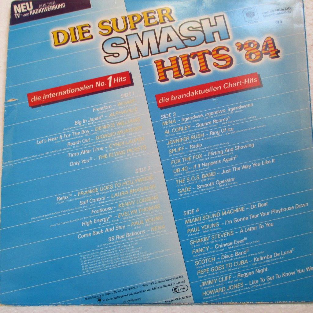 Various Artists – Die Super Smash Hits ’84 2LP : Alphaville, Wham, Cyndi Lauper, Frankie Goes To Hollywood, Laura Branigan, Paul Young, Nena, Jennifer Rush, Fancy, Scotch …